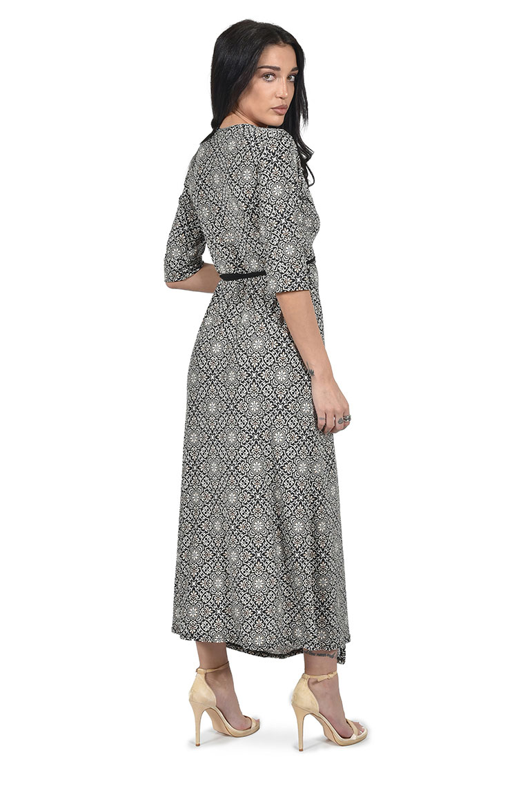 A long wrap dress is a feminine and flattering choice for dinners or cocktail parties. Made from beautifully draped jersey, it has a wrap-effect bodice and boho print that makes it so lovely. Wear it with simple accessories and a short jacket.