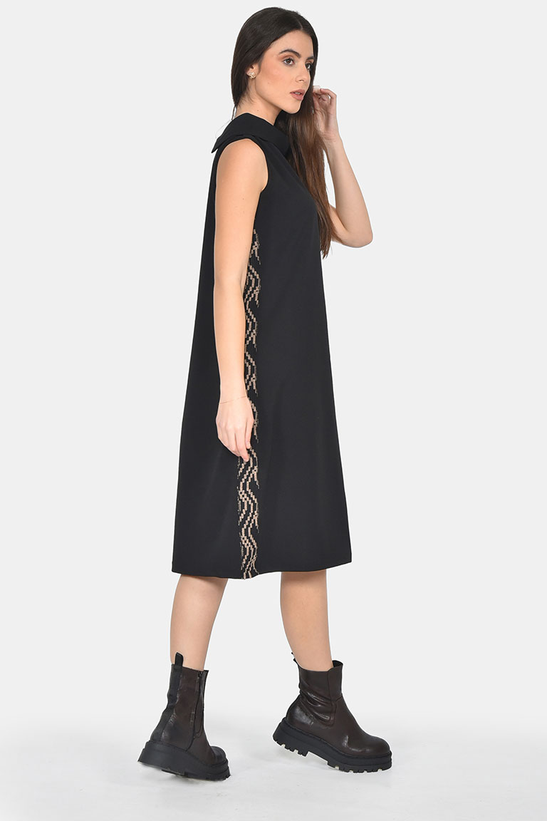 Midi trimmed dress in elastic crepe wih a loose collar that falls to a split behind. Wear yours with ankle boots and a clutch.