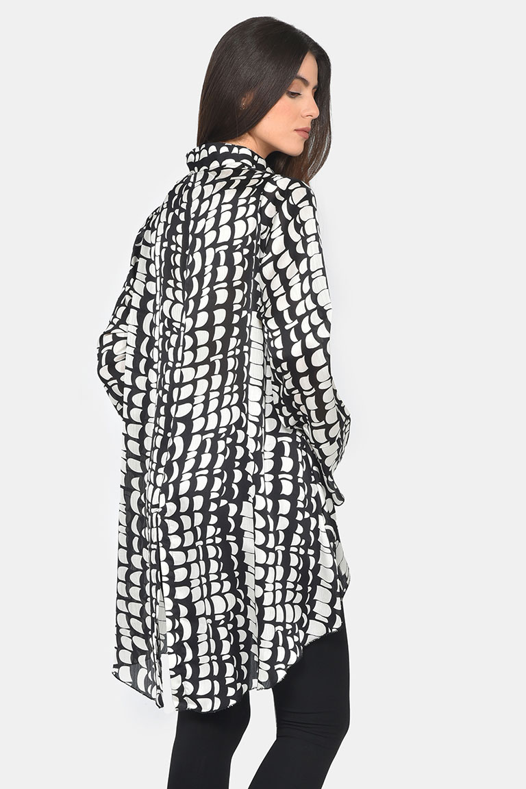 Ασπρόμαυρο oversized πουκάμισο από ζωρζέτα με ασύμμετρο πατρόν που σε συνδυασμό με την αέρινη υφή του, το κάνει να ξεχωρίζει . Συνδυάστε το με τζήν ή με ένα μαύρο κολάν για στυλάτες εμφανίσεις.