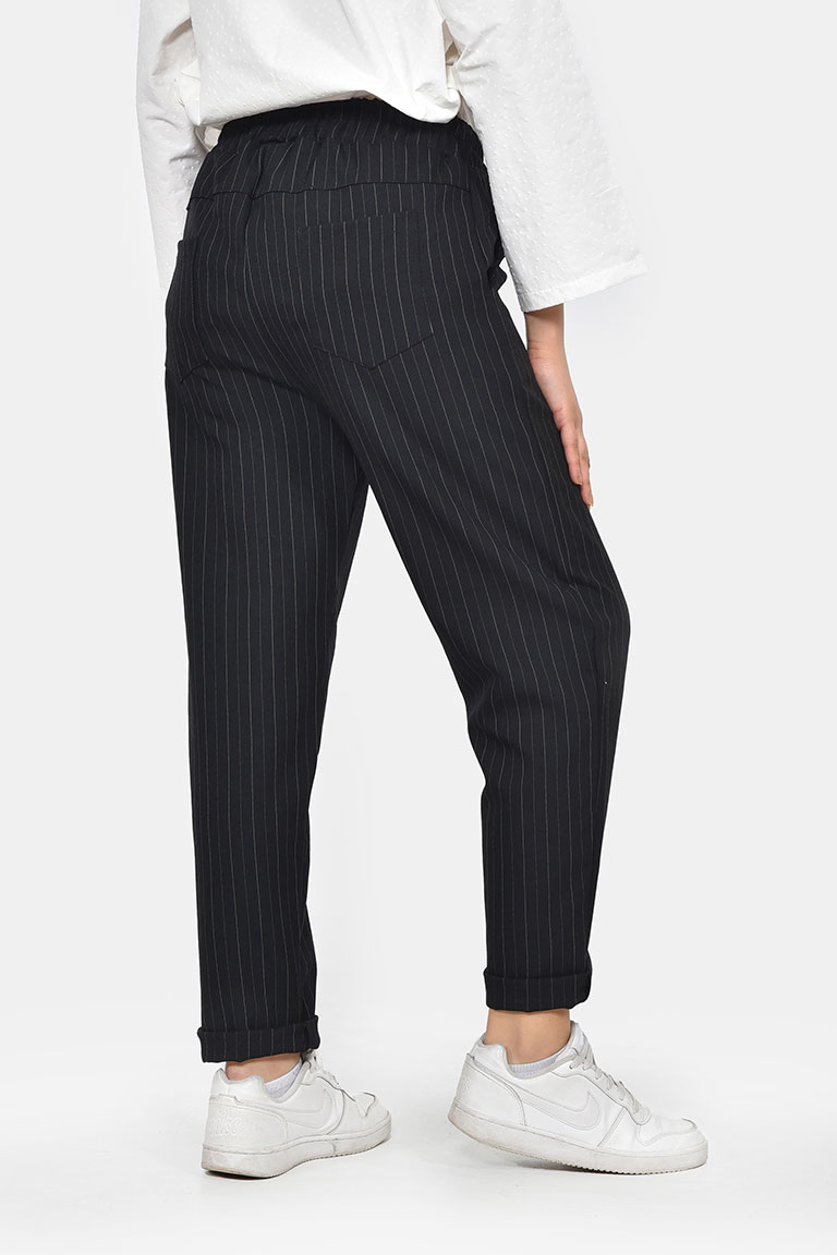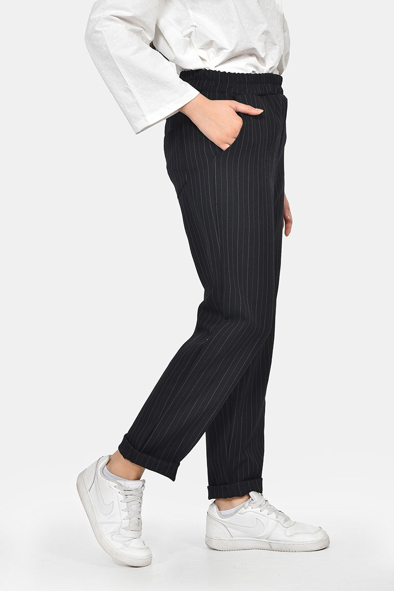Μαύρο ριγέ παντελόνι σε ανδρική γραμμή, τόσο κλασικό και διαχρονικό που πάντα θα κάνει την εμφάνισή μας στυλάτη και αδιαμφισβήτητη ,ειδικά συνδυασμένο με ένα λευκό πουκάμισο. Σε ασπρόμαυρη καπαρντίνα τέλεια για τη μεταβατική περίοδο της άνοιξης. 50%βισκόζη 50% πολυέστερ