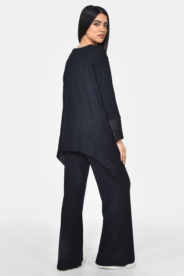 Μαύρο ριμπ σετ από ασύμμετρη μπλούζα και ίσιο παντελόνι