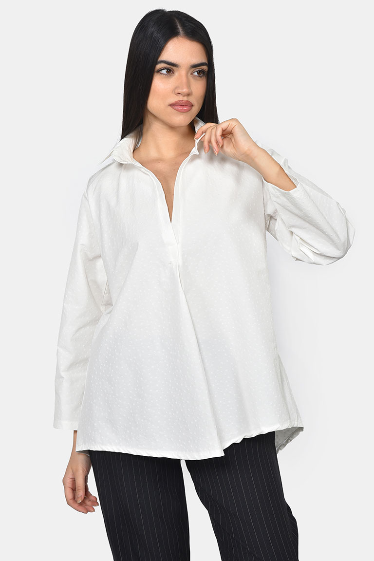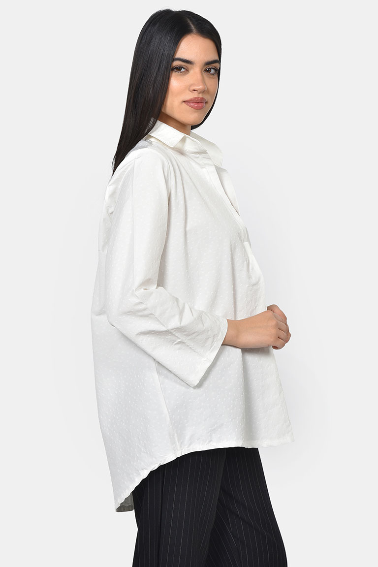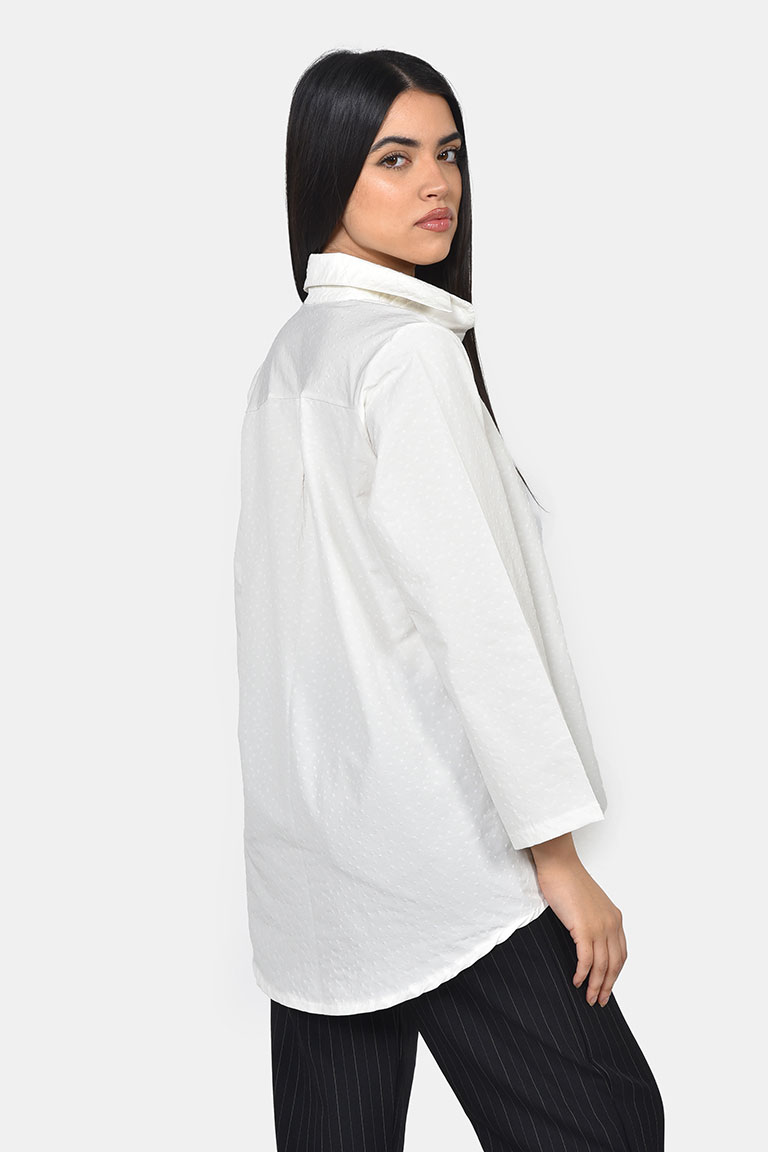 Ασπρη πουκαμίσα σε ανάγλυφη βαμβακερή ποπλίνα κάθε άλλο παρά ένα κλασικό άσπρο πουκάμισο γιατί το ασύμμετρο πατρόν του σε συνδυασμό με την ιδιαίτερη ανάγλυφη ύφανση, το κάνει να ξεχωρίζει . Συνδυάστε το με τζήν ή με ένα σίγκαρετ μονόχρωμο για στυλάτες εμφανίσεις. 100% βαμβάκι