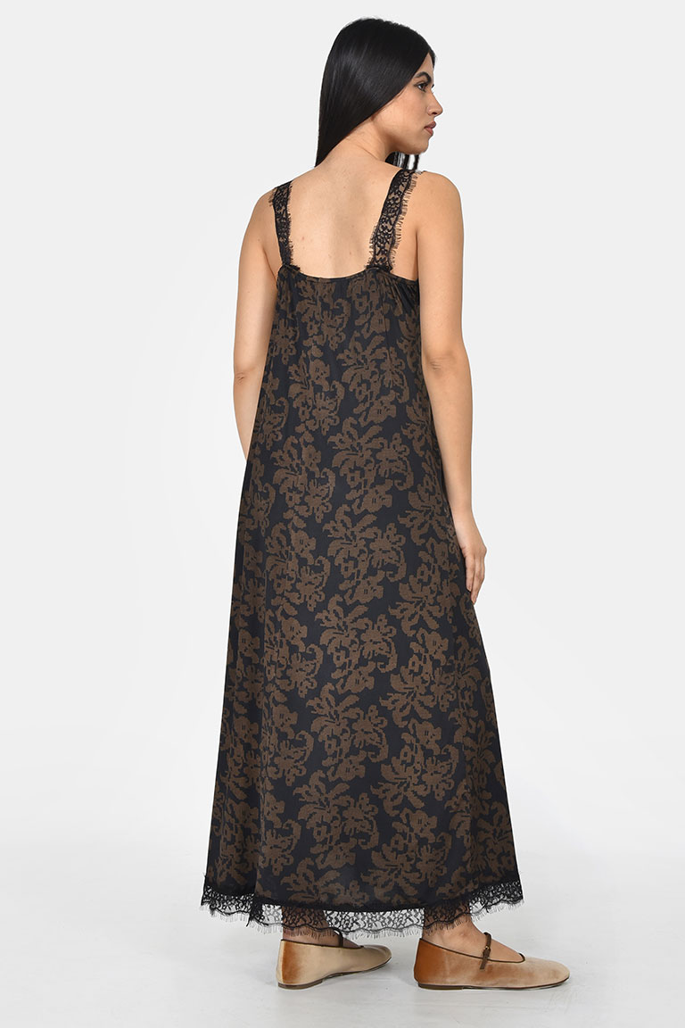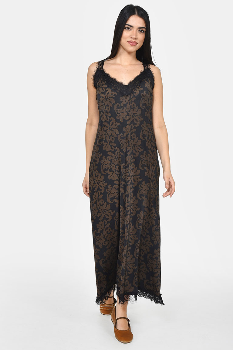 Φόρεμα σε εμπριμέ μαγιόπανο σε ίσια χαλαρή γραμμή , και σε ελαστική ποιότητα υφάσματος για να νιώθετε άνετη .Οι δαντελωτές τιράντες και τελειώματα δαντέλας το κάνουν ιδιαίτερο και κατάλληλο να φορεθεί όλες τις ώρες της ημέρας και για όλες τις περιστάσεις. Συνδυάστε το με χαμηλά παπούτσια και απλά κοσμήματα.